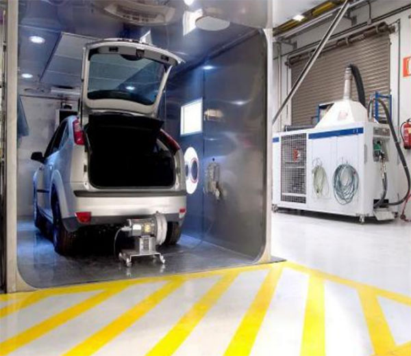 然后,再將其推回試驗間,密閉并保溫1小時,稱為熱浸試驗。同時測試室內碳氫化合物的濃度變化,并記錄其平均值。晝間換氣與熱浸試驗所測試得的碳氫化合物濃度的總和,即為試驗車輛燃油蒸發(fā)試驗的總排放量。這種方法試驗設備價格昂貴,但測試精度高,能夠測試整個車輛(包括燃油系統(tǒng)、內飾涂料、噴漆、輪胎等)揮發(fā)出來的碳氫化合物污染物總量,是國外用來測試燃油蒸發(fā)排放量的較為普遍的試驗方法。